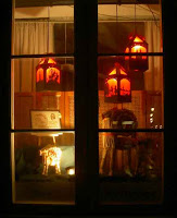 Nu hänger mina lyktor där - i Sigtuna i Handelsbankens fönster - och lyser så rött och vackert när det skymmer.